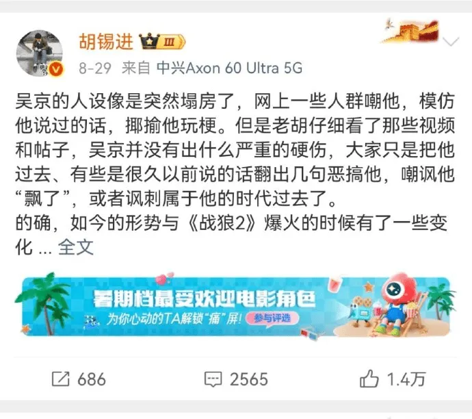 媒体人胡锡进发文为吴京鸣不平。他表示:“吴京的人设像是突然塌房了,网上一些人群嘲他,模仿他说过的话,揶揄他玩梗。但是老胡仔细看了那些视频和帖子,吴京并没有出什么严重的硬伤。”胡锡进点出,吴京最大的问题是和爱国英雄的形象绑得太紧,作为一名演员,戏路太窄将是一大风险。他建议吴京“心理需要强大”,同时也呼吁网友“在吴京没犯什么错的情况下如果搞过头,就不太公正了”。